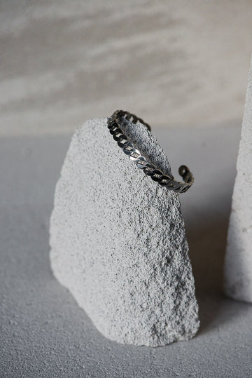 Sidabro spalvos persipynusių linijų žiedas