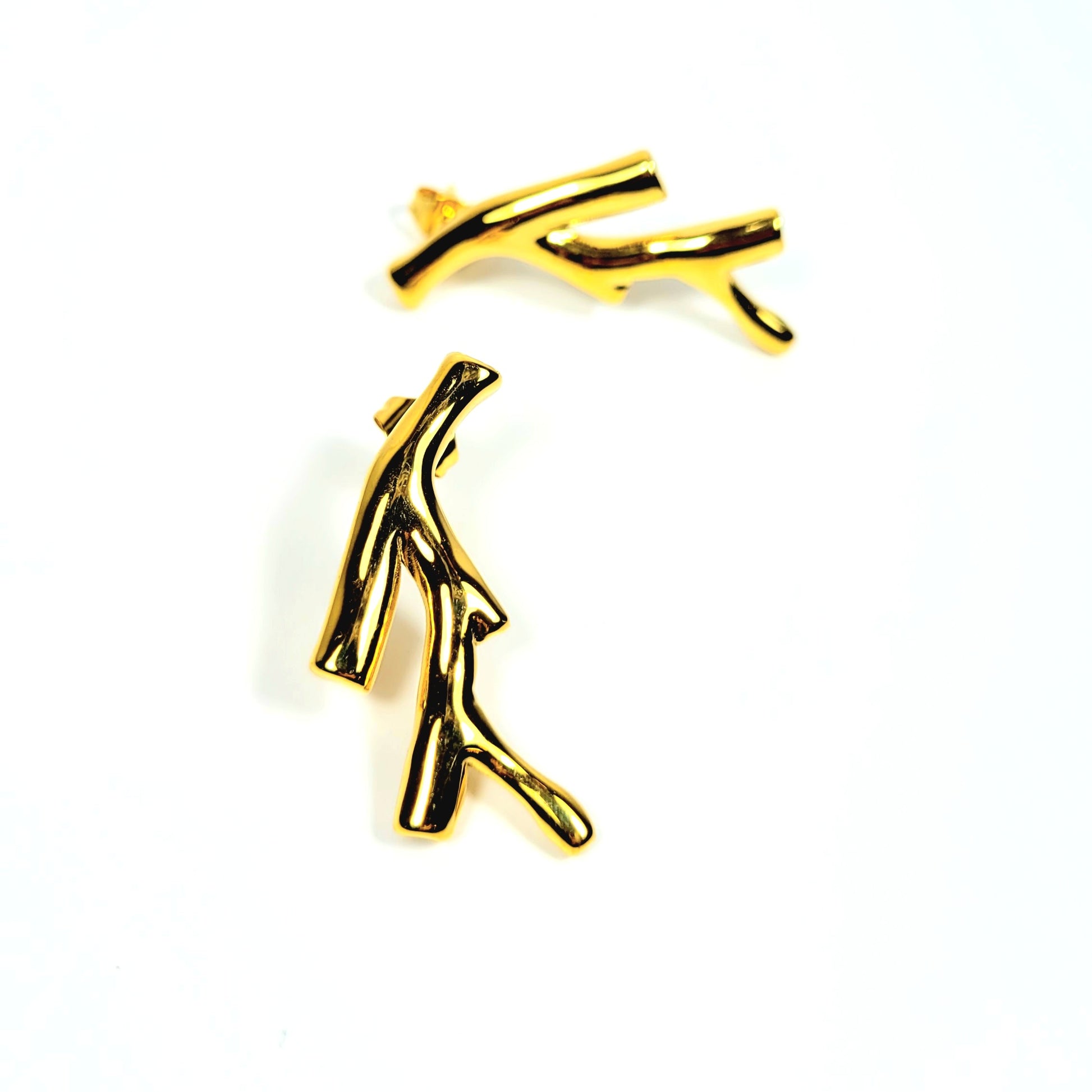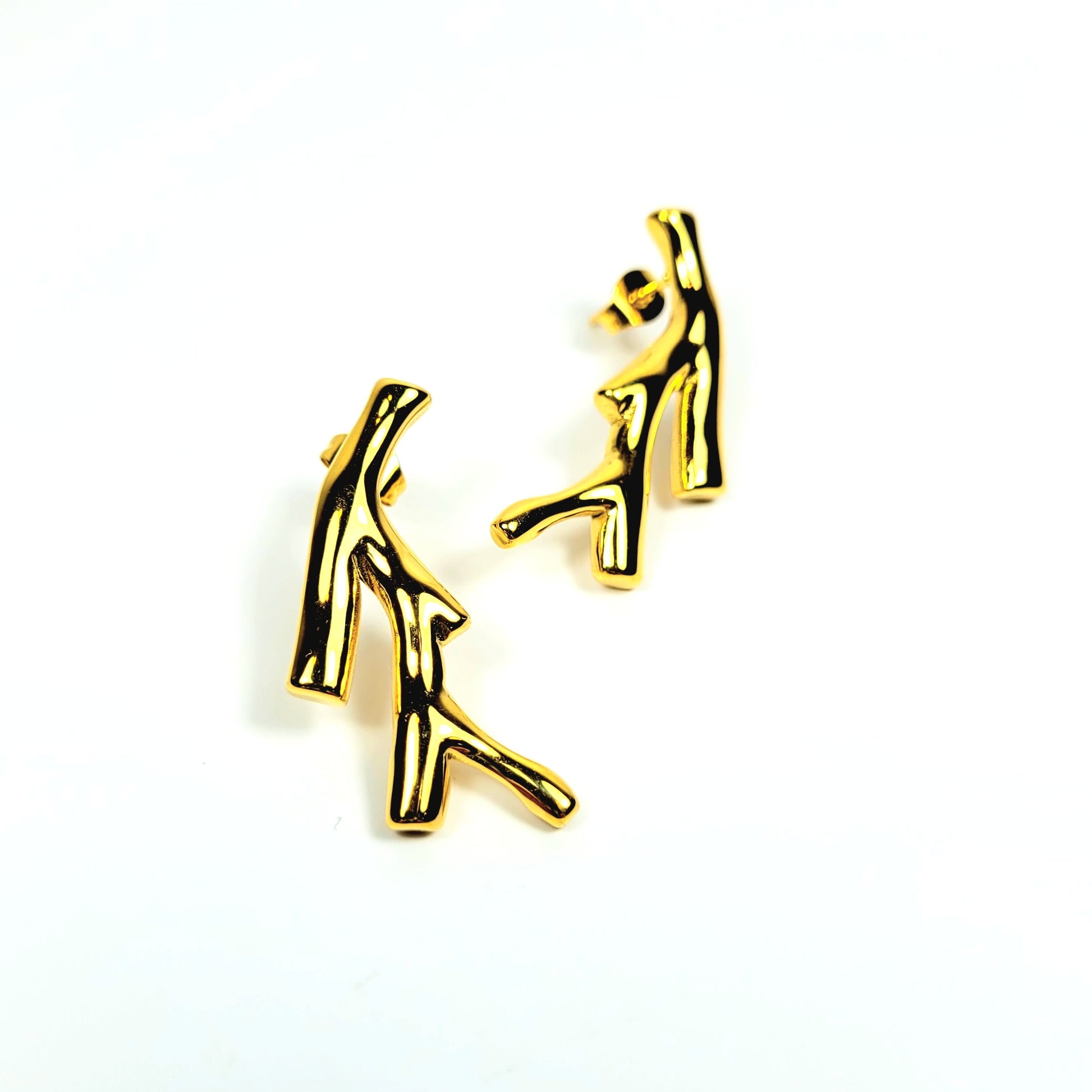 Įkvėpti gamtos formų, šie auskarai primena smulkias auksines šakeles. Organinis dizainas sukuria subtilų judesio įspūdį, o blizgus paviršius suteikia šviesos ir elegancijos. Jie atrodo išskirtinai, bet išlieka minimalistiniai – puikus pasirinkimas mėgstančioms natūralius, bet modernius akcentus. Šie auskarai dera tiek prie kasdienės aprangos, tiek prie šventinio įvaizdžio. Pagaminti iš nerūdijančio plieno, todėl išlieka patvarūs, neblunka ir išsaugo auksinį spindesį net po ilgo dėvėjimo.