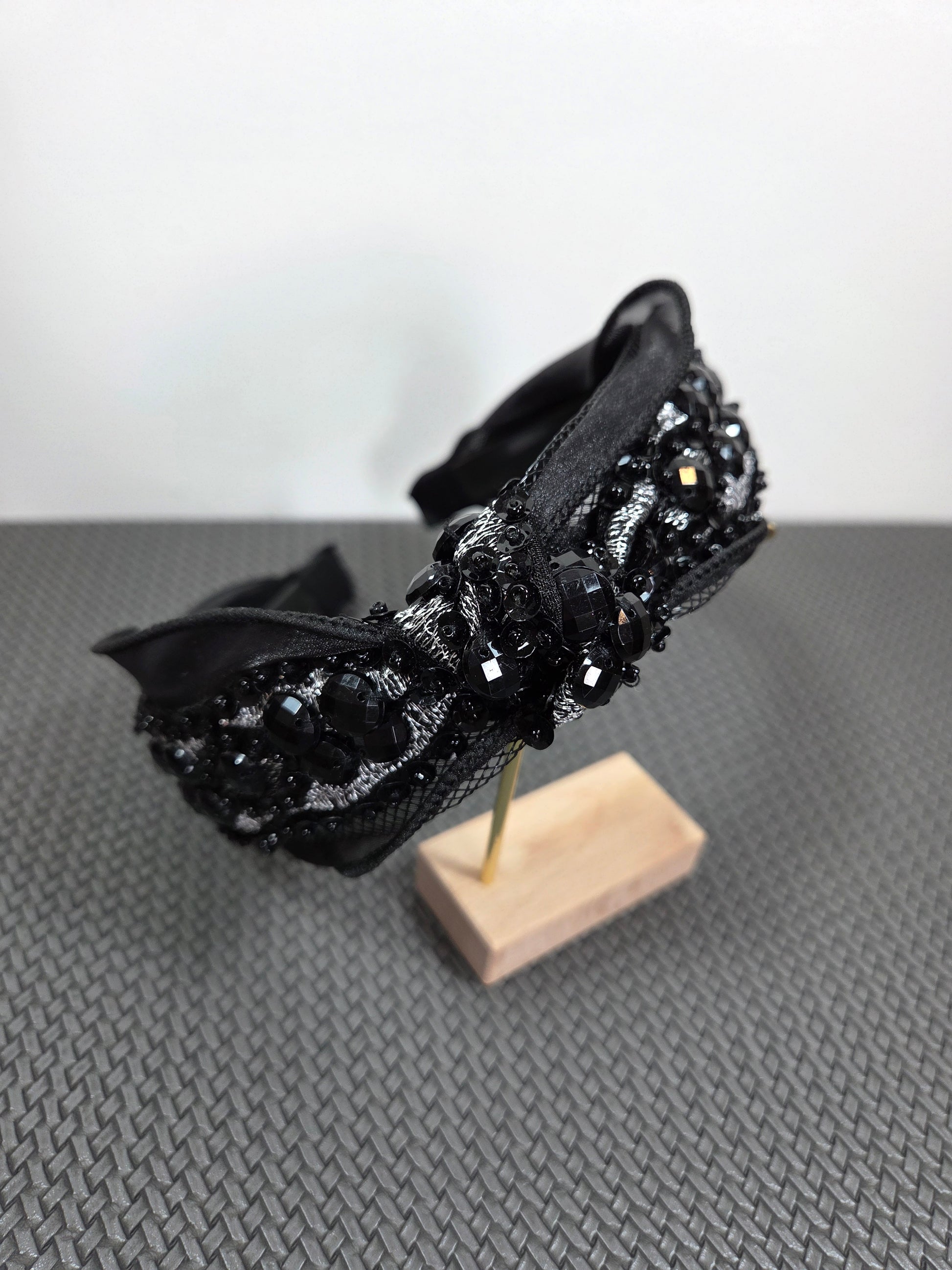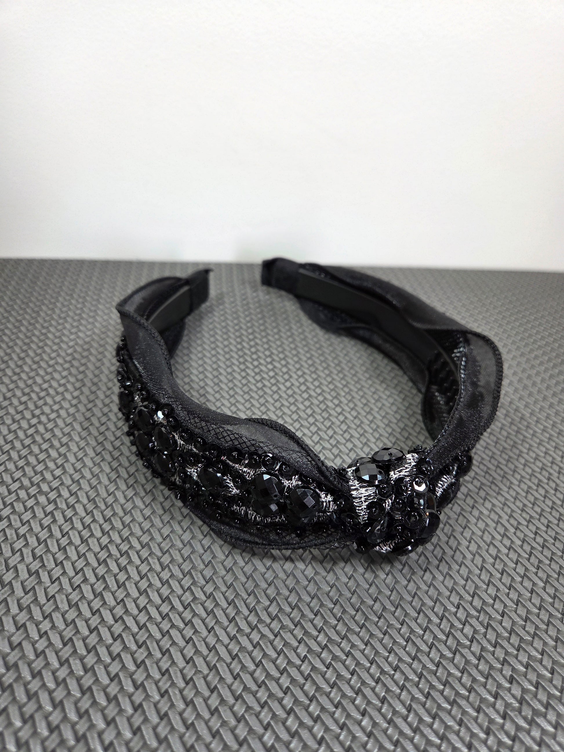 Juodas prabangus plaukų lankelis su karoliukais