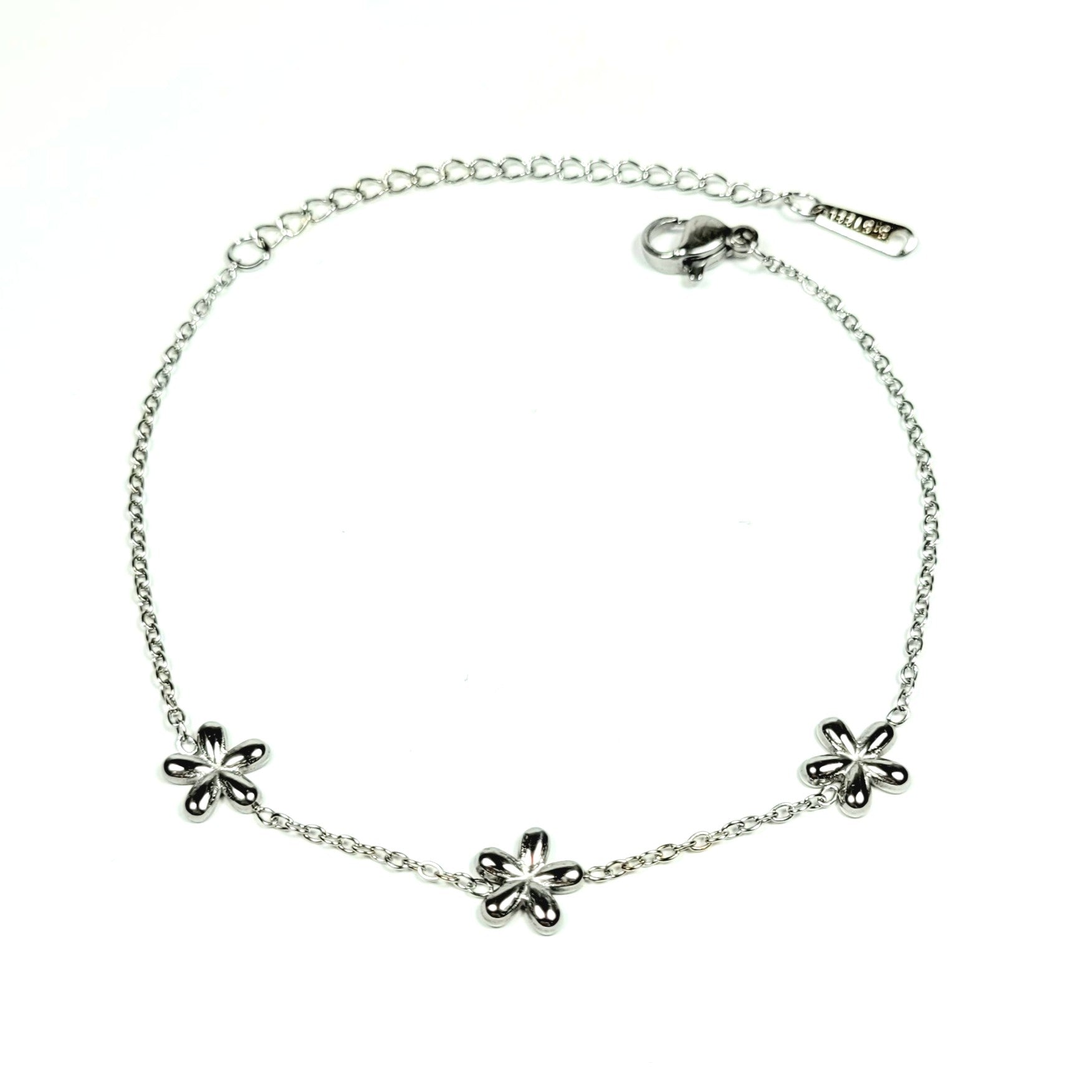 Plona sidabro spalvos apyrankė su 3 gėlytėmis