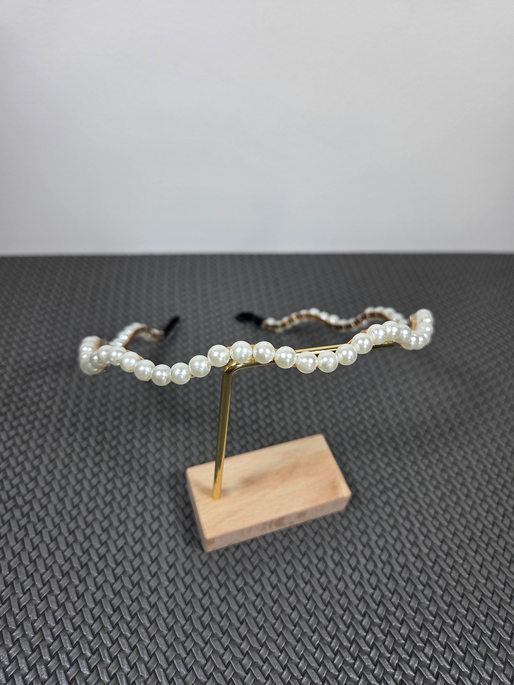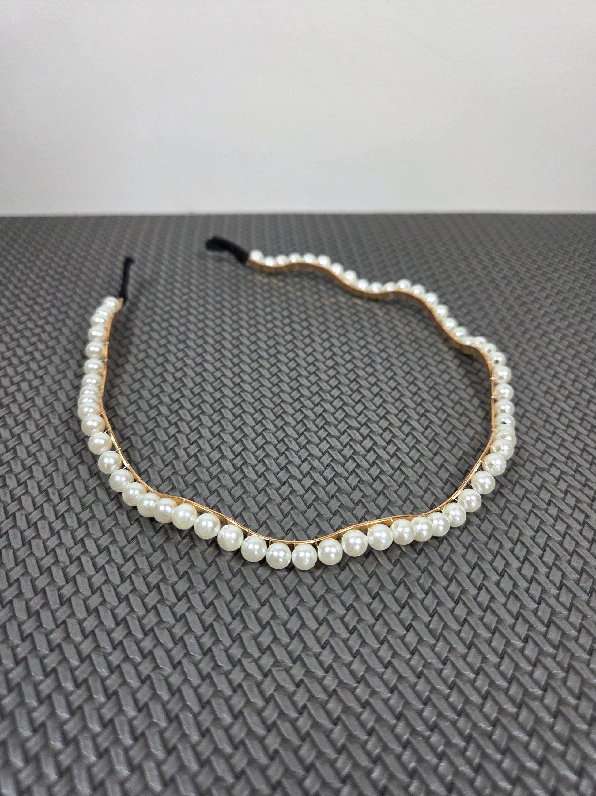 Siauras banguotos formos plaukų lankelis su baltais perliukais