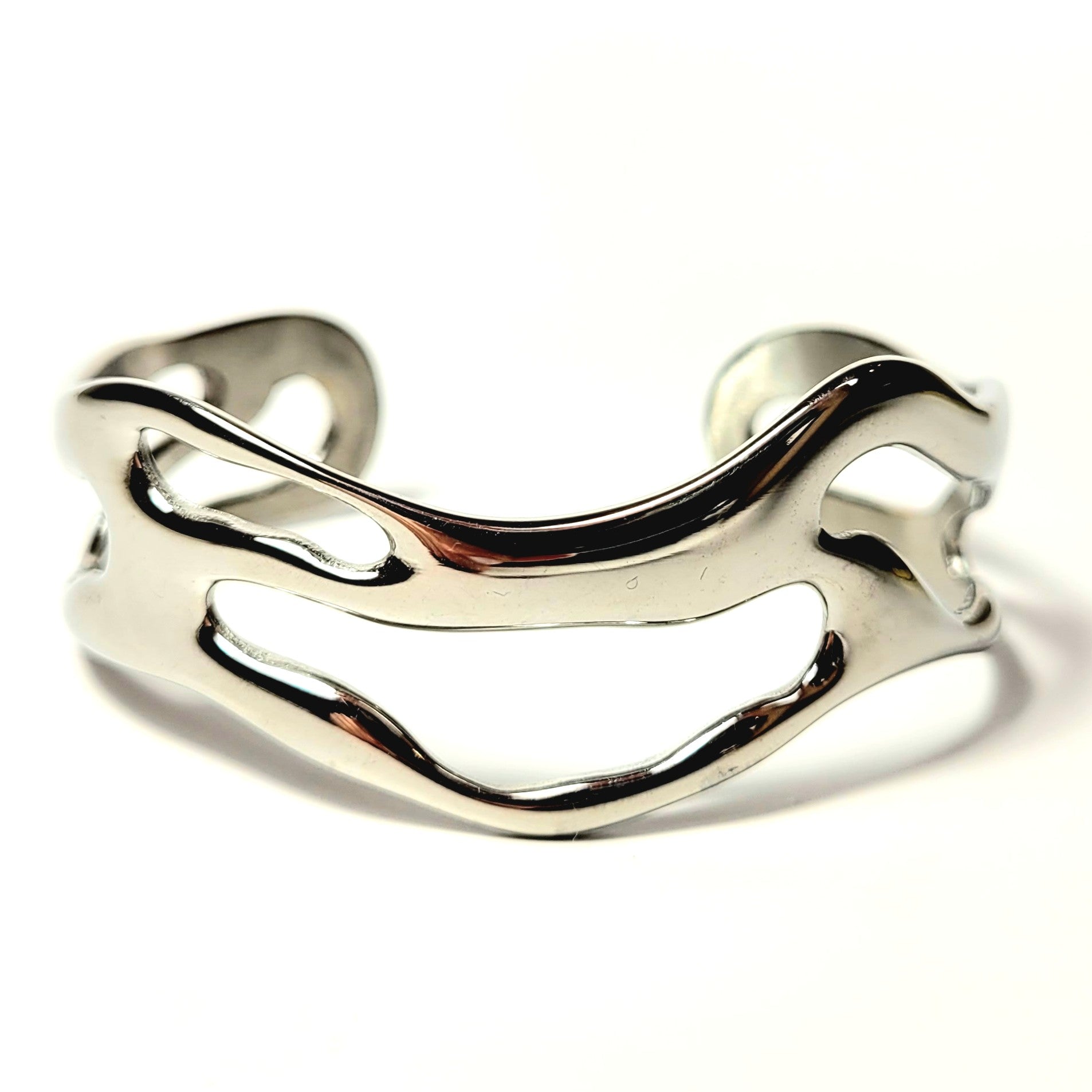 Ši išraiškingo dizaino apyrankė iš nerūdijančio plieno sukurta moderniam ir savitą stilių mėgstančiam įvaizdžiui. Skulptūriškos, banguotos formos linijos primena judesį ir suteikia papuošalui lengvumo bei dinamikos. Blizgus sidabrinis paviršius pabrėžia formų žaismą, o atviras modelis leidžia patogiai pritaikyti prie riešo. Tai stilingas aksesuaras, kuris vienu metu atrodo minimalistinis ir drąsus – puikiai tinka tiek kasdienai, tiek ypatingai progai.
