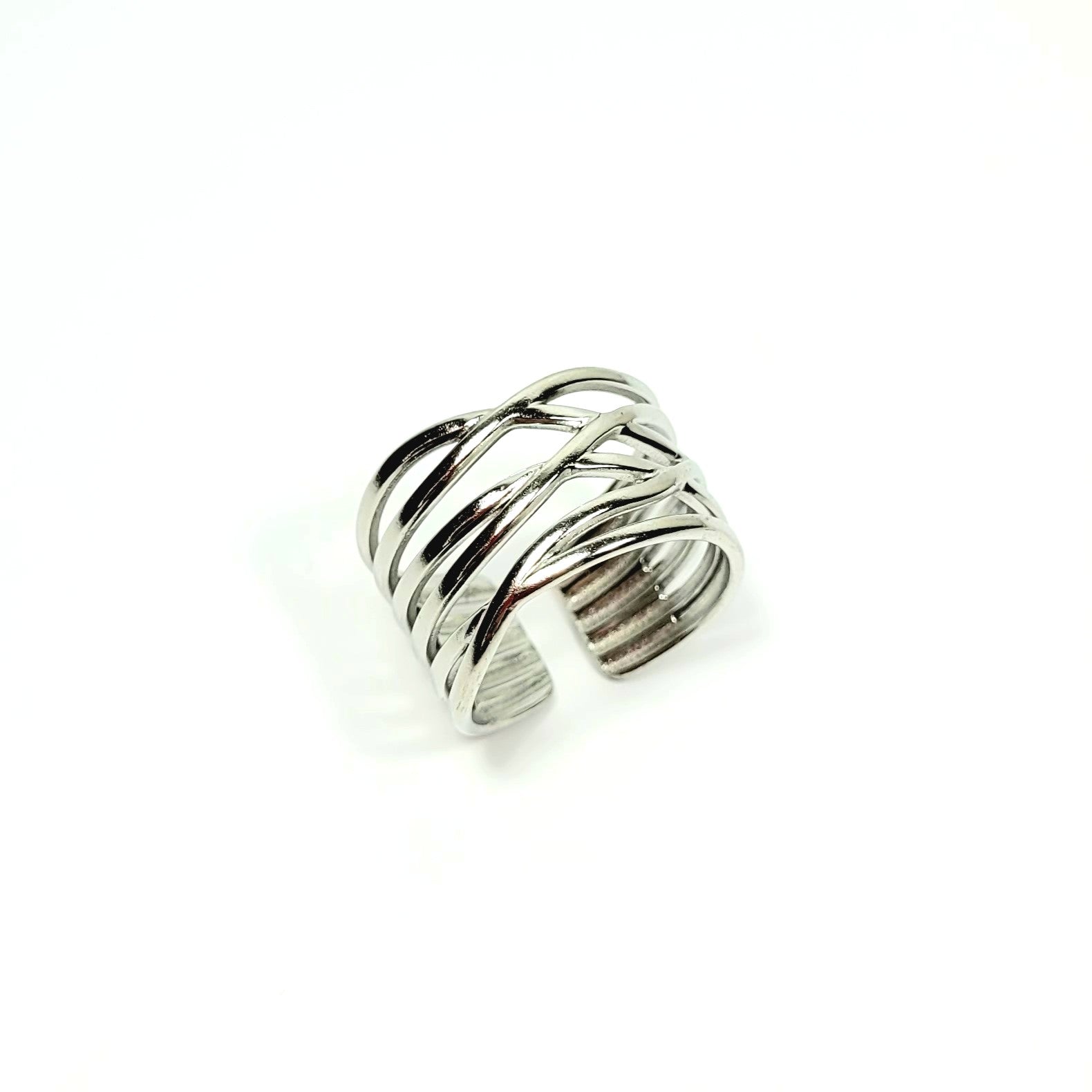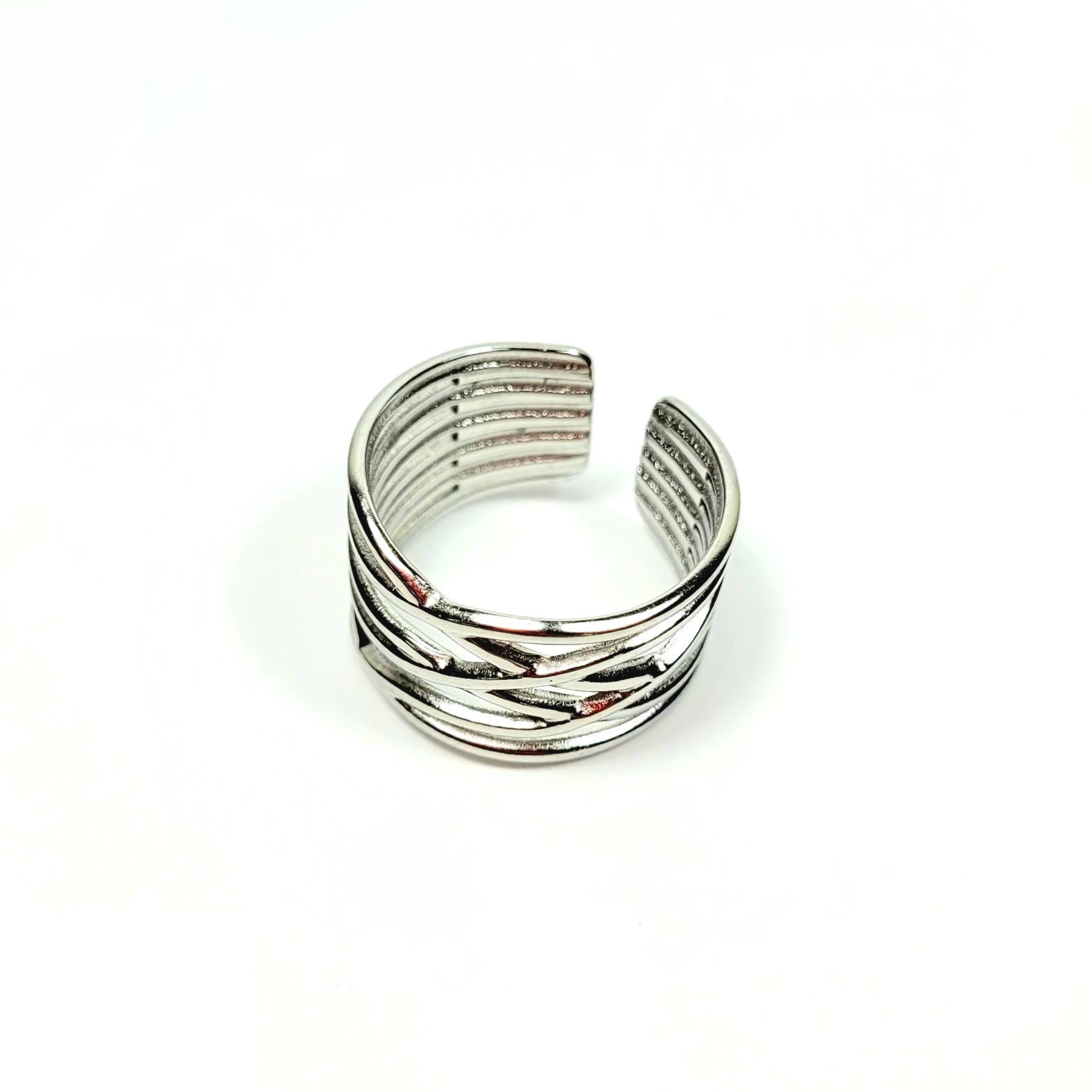 Sidabro spalvos modernus persipynusių linijų žiedas